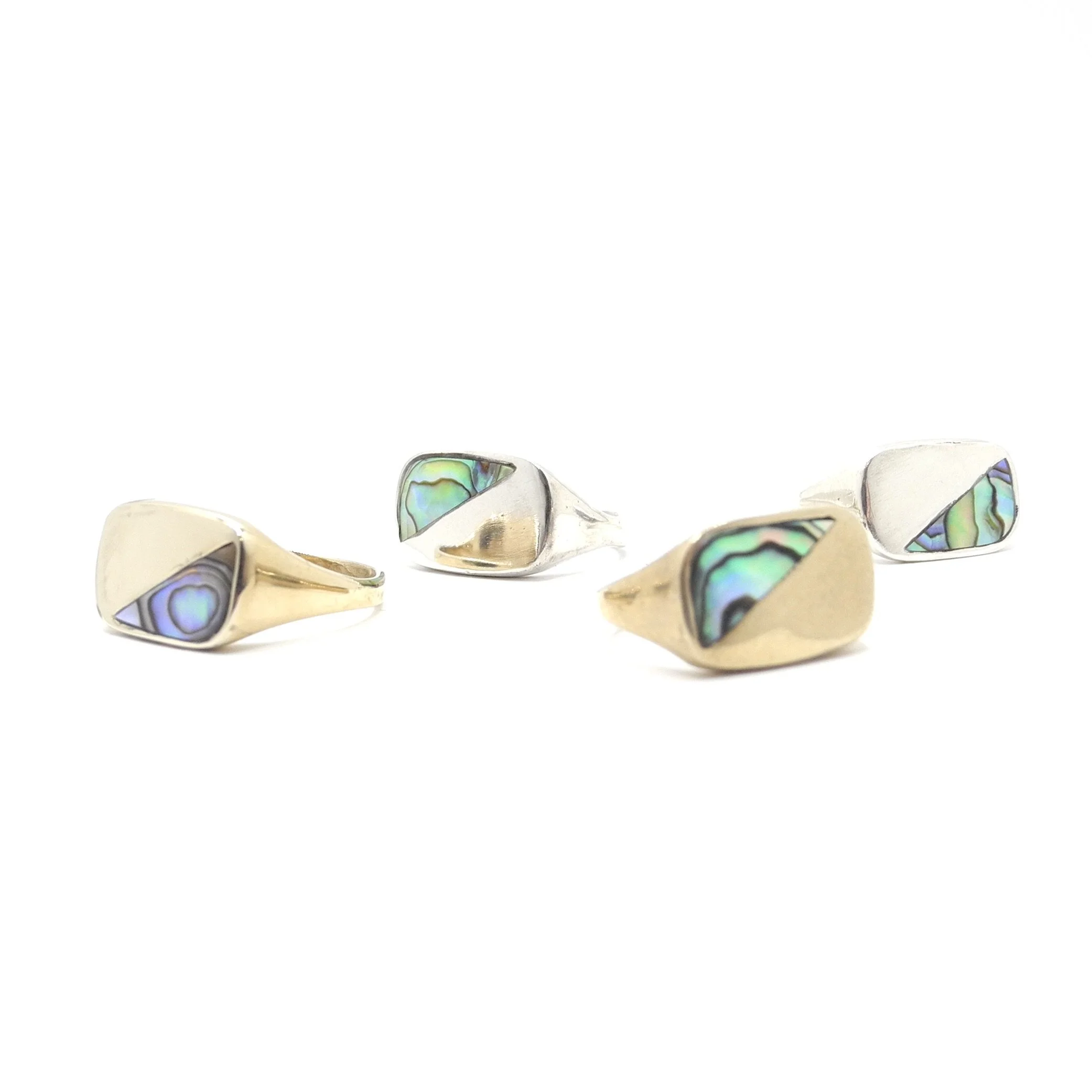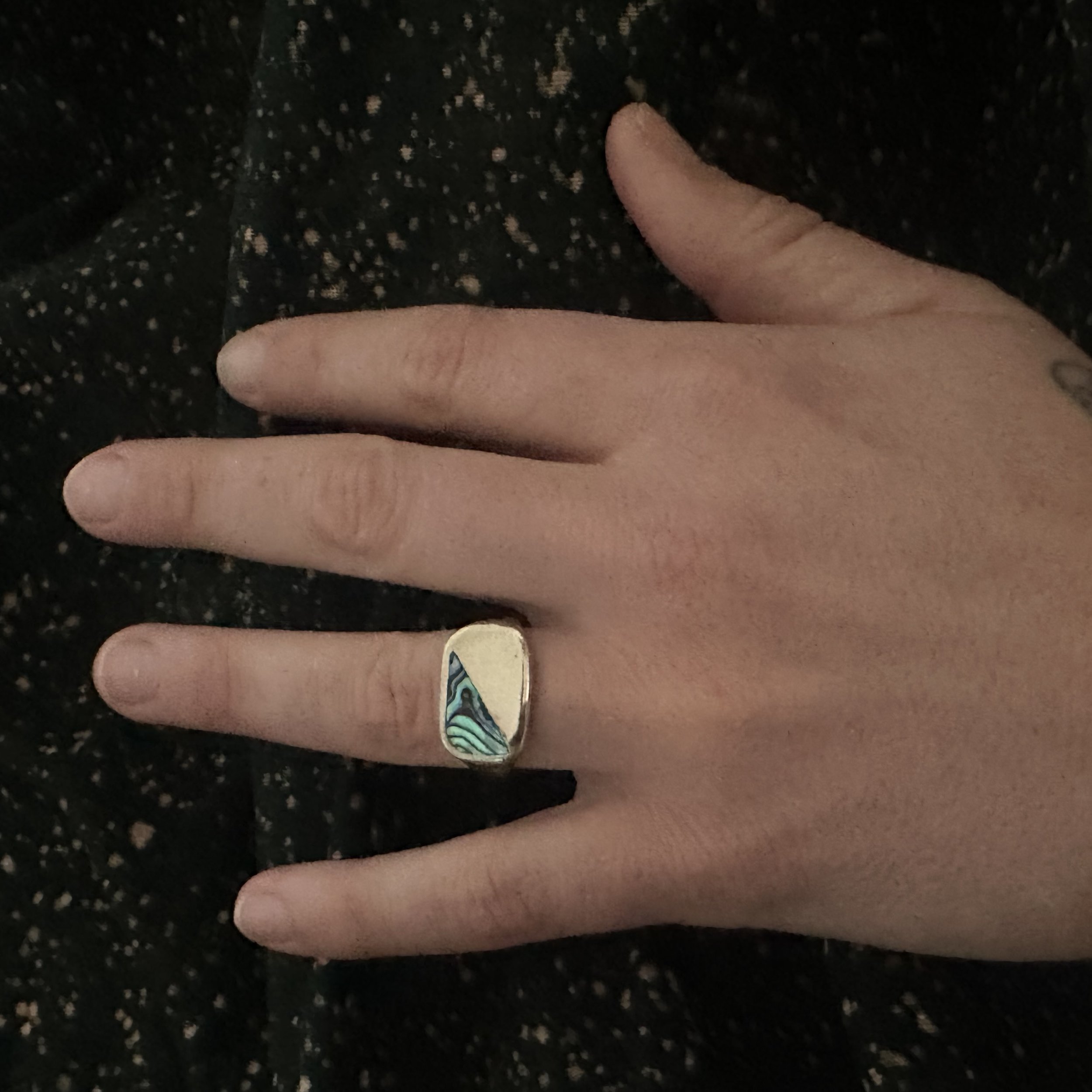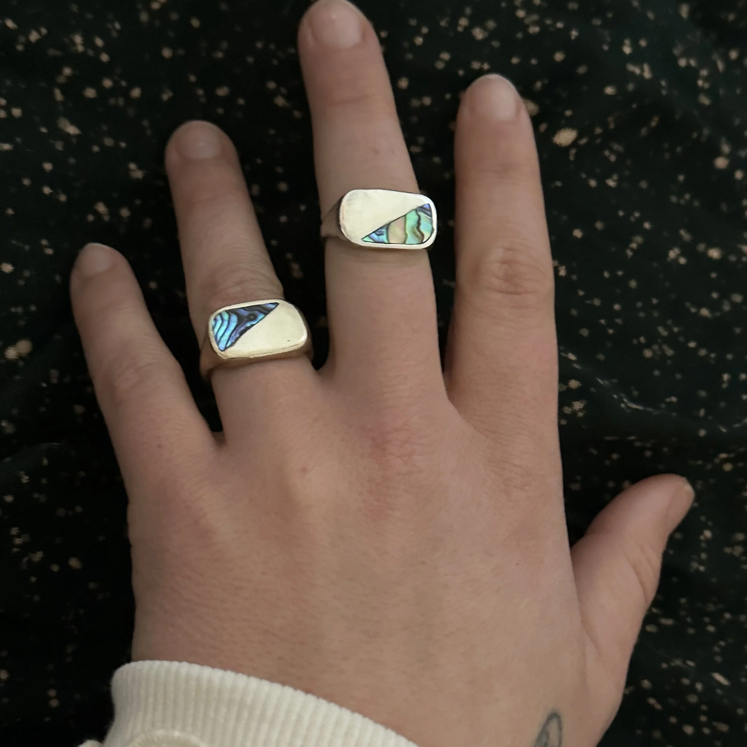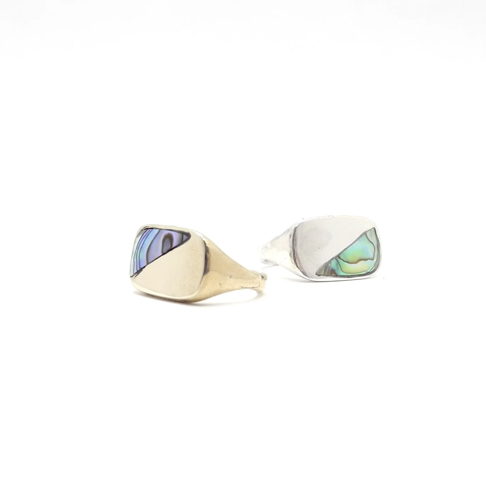 A signet style ring with a triangle inlay of abalone shell. Additional sizes and metals available upon request.