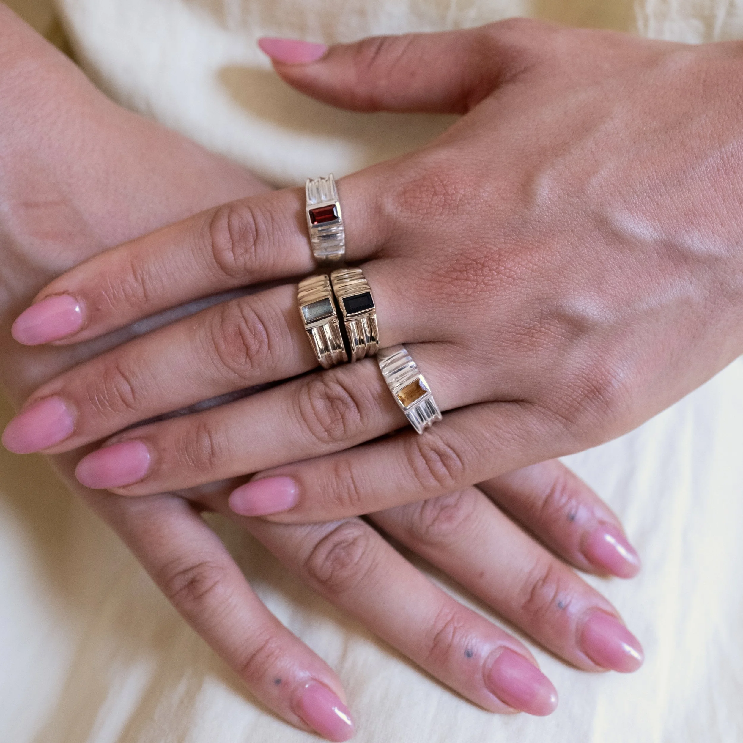 A sleek and subtle luxury ring with a 3x6mm stone. Available in brass or silver. Additional sizes and materials available upon request.