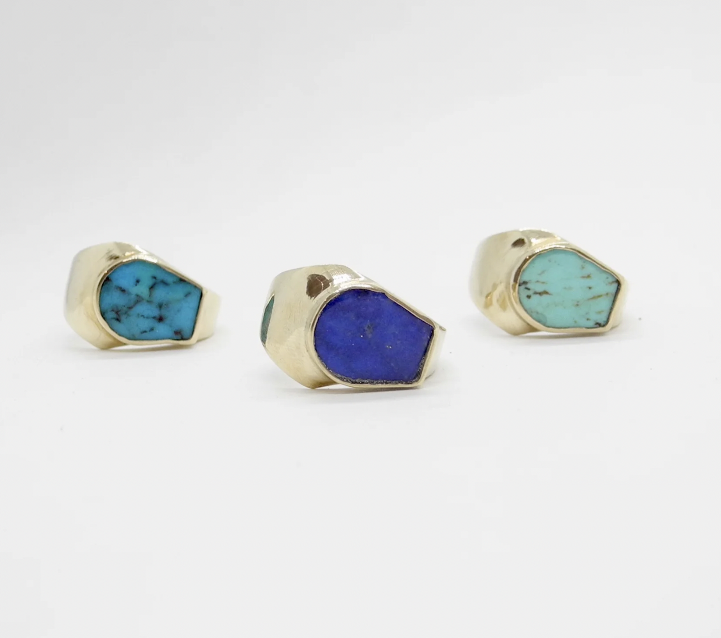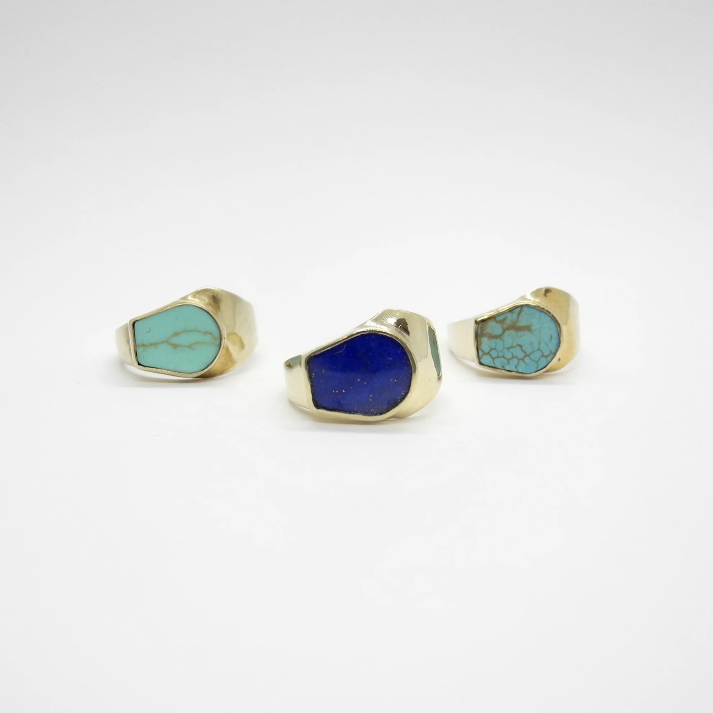 A unique stone cut and set into an elegant brass or silver ring. The stone is about 1/2" wide and 3/8" at the highest part. Each stone is unique and varies slightly. Additional sizes and metals available upon request.