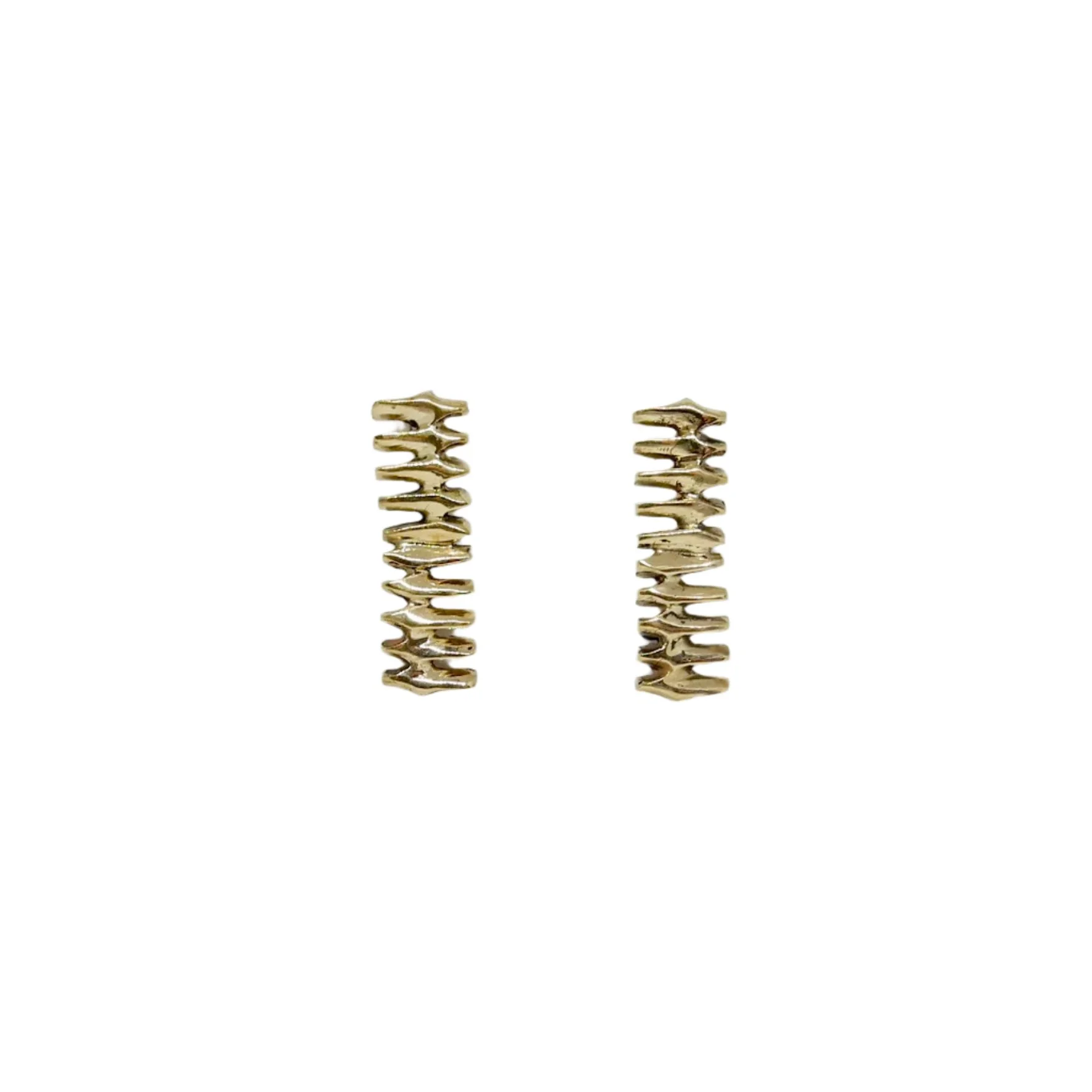 Silver or brass earring measures approximately 1 1/8" long x 3/8" wide. The brass earrings have silver posts and backs.