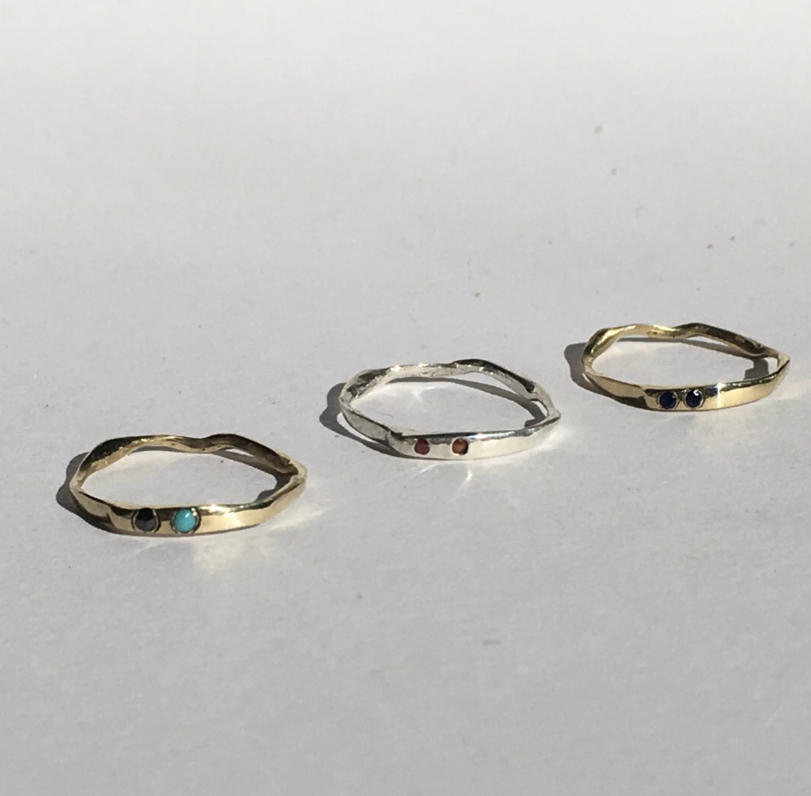 A organically shaped delicate band with two 1.75mm gem stones. A great ring for stacking or on its own.